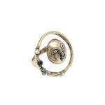 Un pezzo unico realizzato in ottone dorato raffigura un cuore sacro allungato affinché possa cingere il dito, fiamma impreziosita da granato.
