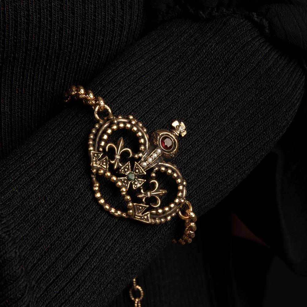 Bracciale con cuore traforato realizzato in ottone dorato ed impreziosito con granati,perle,smeraldi e swarovski.