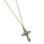 Collana realizzata interamente a mano in ottone dorato. Il ciondolo a forma di croce è impreziosito da pietre preziose, che donano un’eleganza senza tempo e un tocco di intensità cromatica.