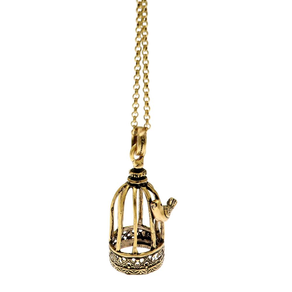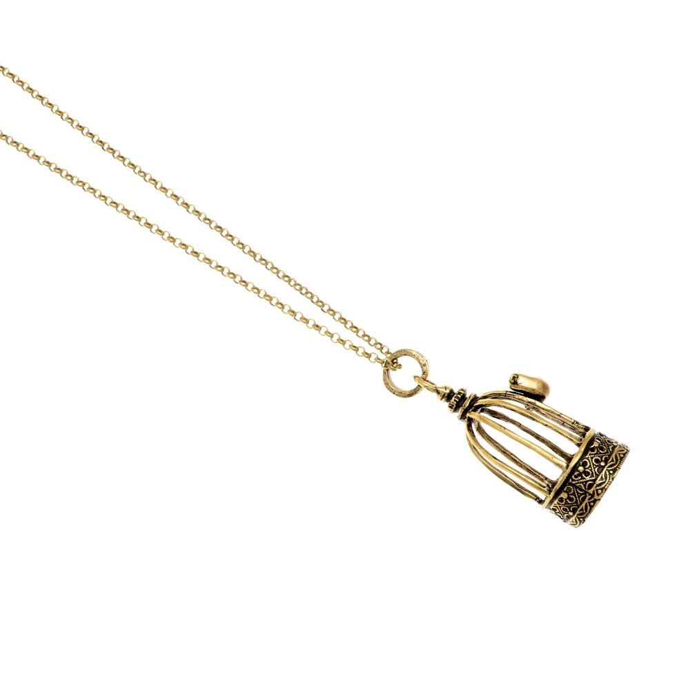 Collana realizzata interamente a mano in ottone e successivamente dorata, ciondolo a forma di gabbia per uccelli