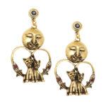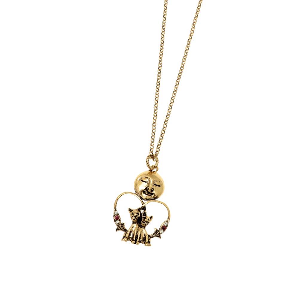 Collana realizzata interamente a mano in ottone dorato. Il ciondolo rappresenta la scena romantica di due gatti al chiaro di luna, impreziosito da pietre preziose.