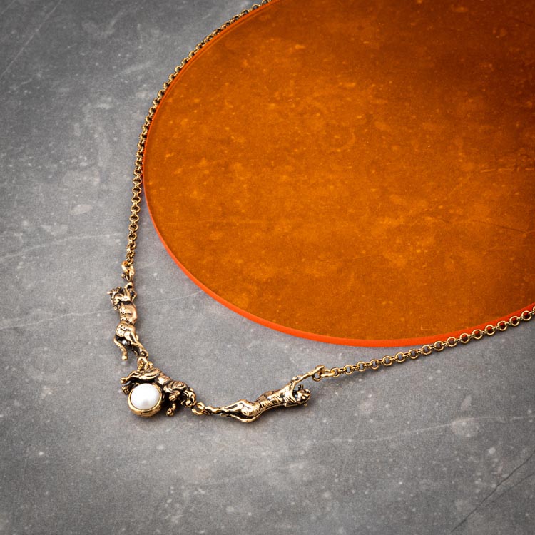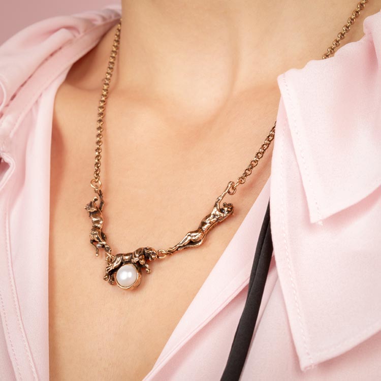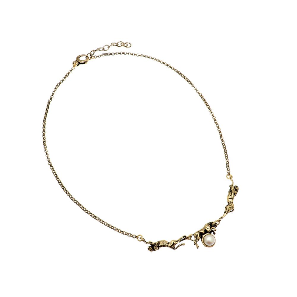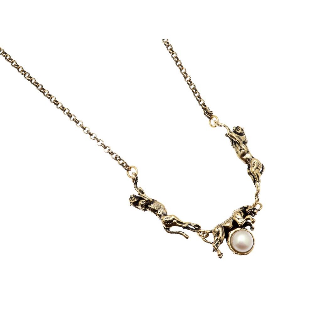 Collana girocollo realizzata da più elementi scolpiti a mano, rappresenta una tigre al centro poggiata sopra un perla e sui lati due giaguari. Un gioiello originale, creato con cura grazie a tecniche artigianali. Dimensione totale girocollo 50cm.