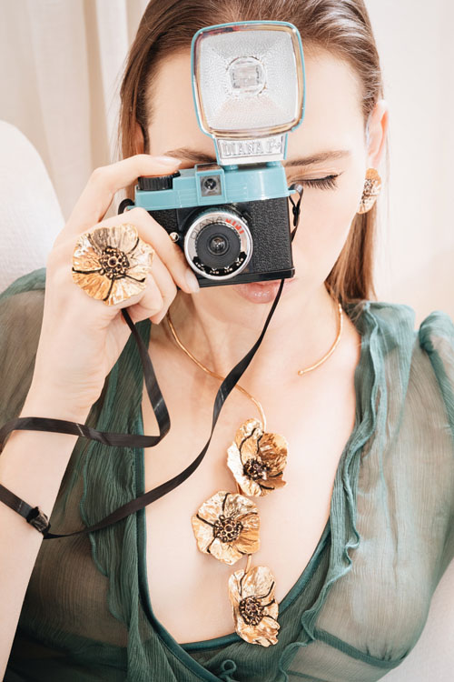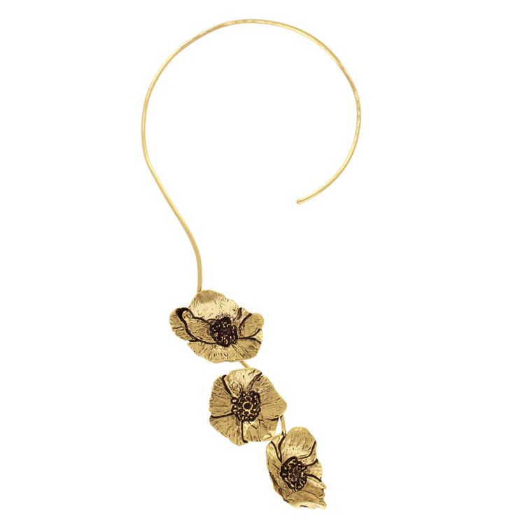 Collana rigida in ottone dorato con tre fiori di papavero impreziositi da granati che scendono impetuosi. Bigiotteria di lusso per adornare il collo con originalità. Dimensione H 15cm L 5cm