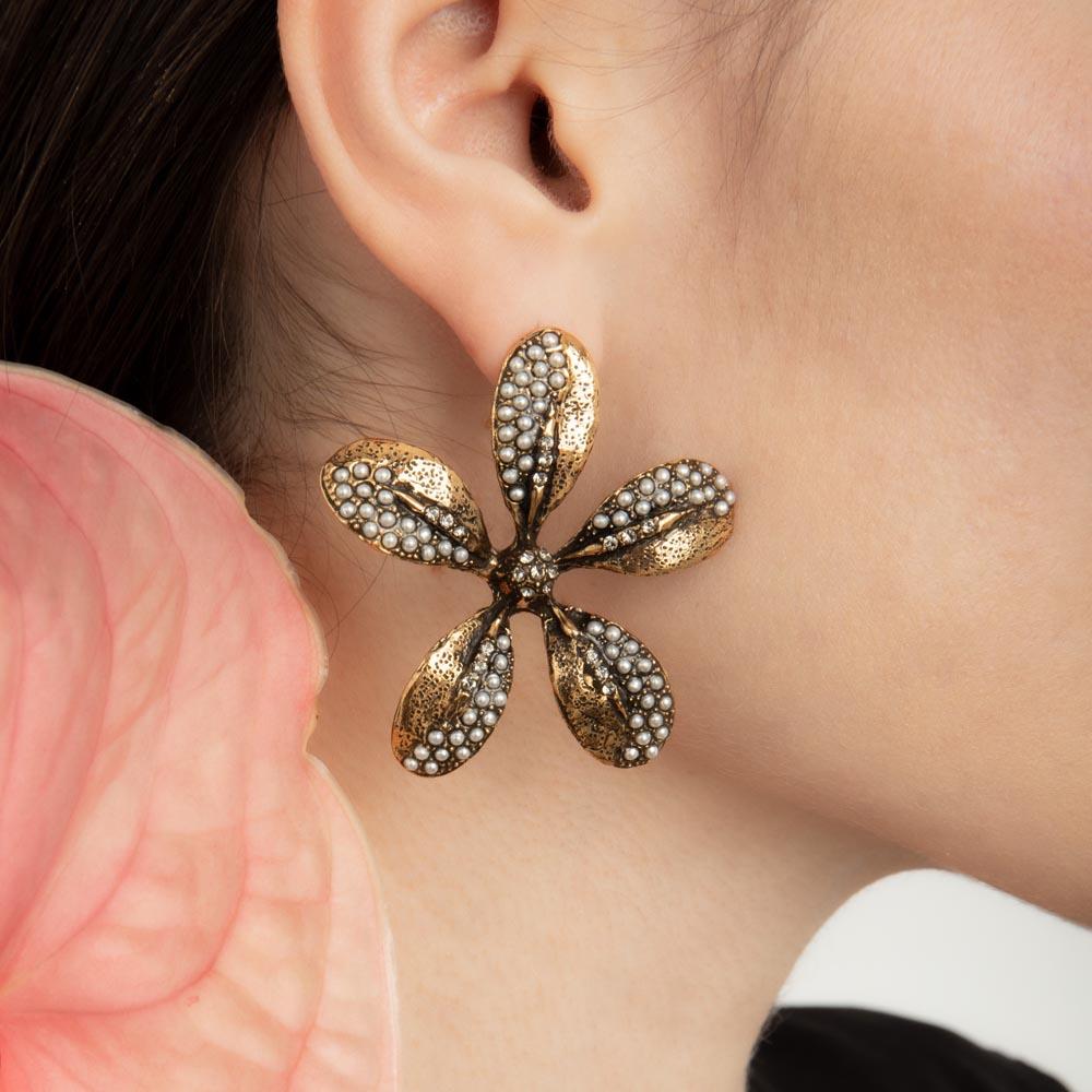 Orecchini realizzati interamente a mano in ottone dorato a forma di fiore. Un gioiello elegante creato secondo la tradizione artigiana impreziosito da perle e swarovski.