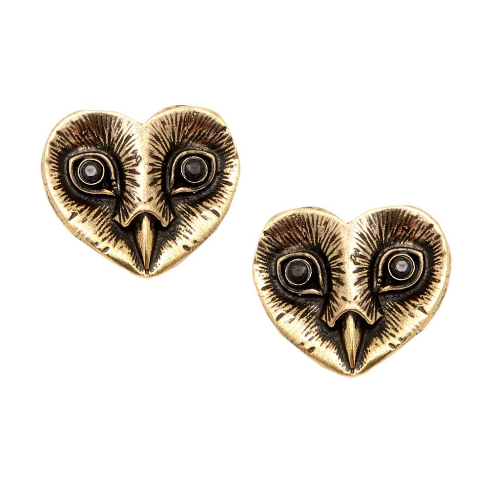 Orecchini pezzo unico realizzato interamente a mano in ottone bagnato in oro, raffigurano un gufo con la testa a forma di cuore impreziosito con zaffiri.