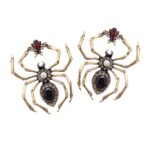 Orecchini in ottone dorato realizzati interamente a mano, raffigurano un ragno impreziosito da perle, granato e swarovski, che tiene tra le sue zampe una moschina di granato e swarovski. Agganciati al lobo tramite clip. Gioiello di alta bigiotteria fatta a mano. Dimensione H 5cm L 3.7cm.